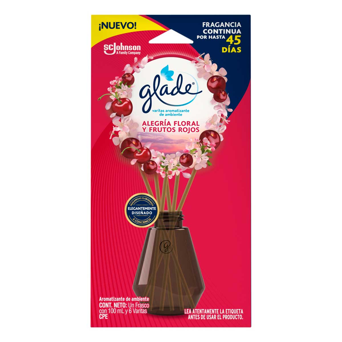 - 3% Aromatizante con Aceite Varitas Glade Alegría Floral y Frutos Rojos Frasco con 100ml y 6 Varitas