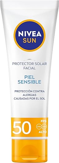NIVEA SUN Protector Solar Facial ofrece protección solar especialmente diseñada para las necesidades de la piel del rostro, además de ayudar a reducir el riesgo de irritación en la piel causada por el sol. Diseñado para piel sensible. Sin perfume. Con FPS 50, su sistema de protección UVA/UVB ayuda a prevenir el daño inducido en la piel tales como el envejecimiento prematuro.